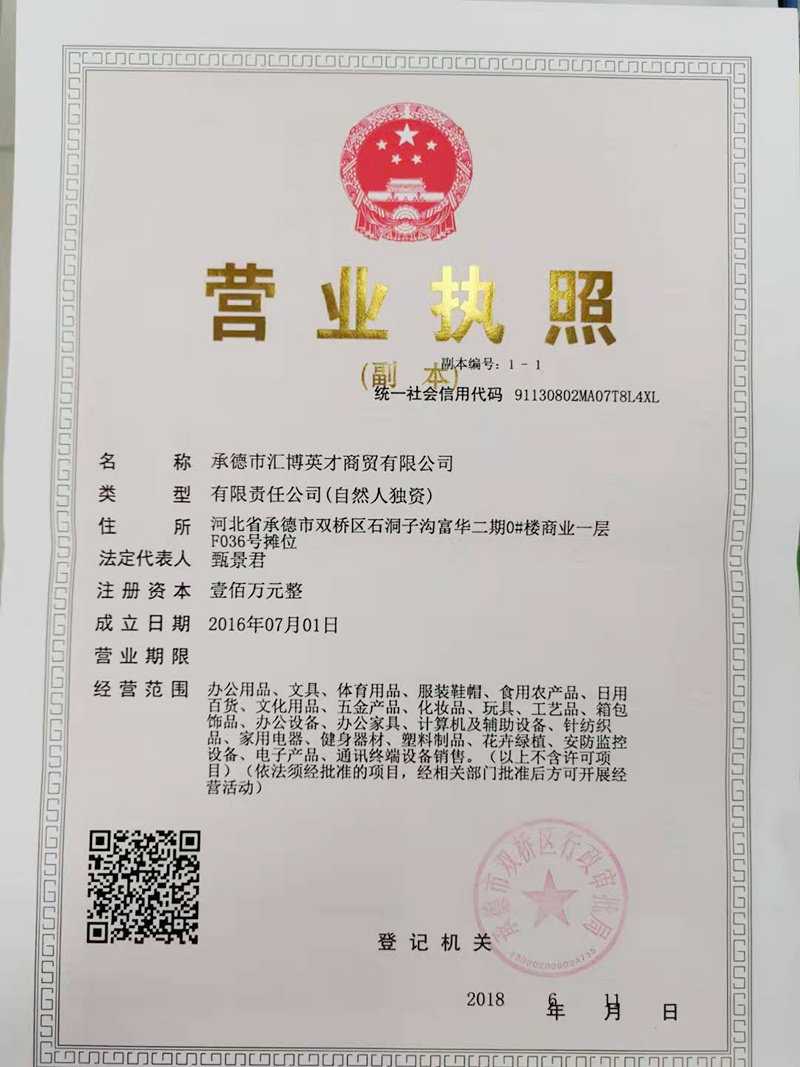 承德市汇博英才商贸有限公司成立于2016年07月01日,注册地位于河北省承德市双桥区,法定代表人为甄景君。经营范围包括办公用品、文具、体育用品、服装鞋帽、食用农产品、日用百货、文化用品、五金产品、化妆品、玩具、工艺品、箱包饰品、办公设备、办公家具、计算机及辅助设备、针纺织品、家用电器、健身器材、塑料制品、花卉绿植、安防监控设备、电子产品、通讯终端设备销售。(以上不含许可项目)(依法须经批准的项目,经相关部门批准后方可开展经营活动),并以共赢、开创经营理念,以全新的管理模式和周到的服务,用心服务于客户,您如果对我们的产品感兴趣或者有任何的疑问,您可以直接给我们留言或直接与我们联络,我们将在收到您的信息后,会及时与您联络。我们始终坚持用户至上,坚持用自己的服务去打动客户。